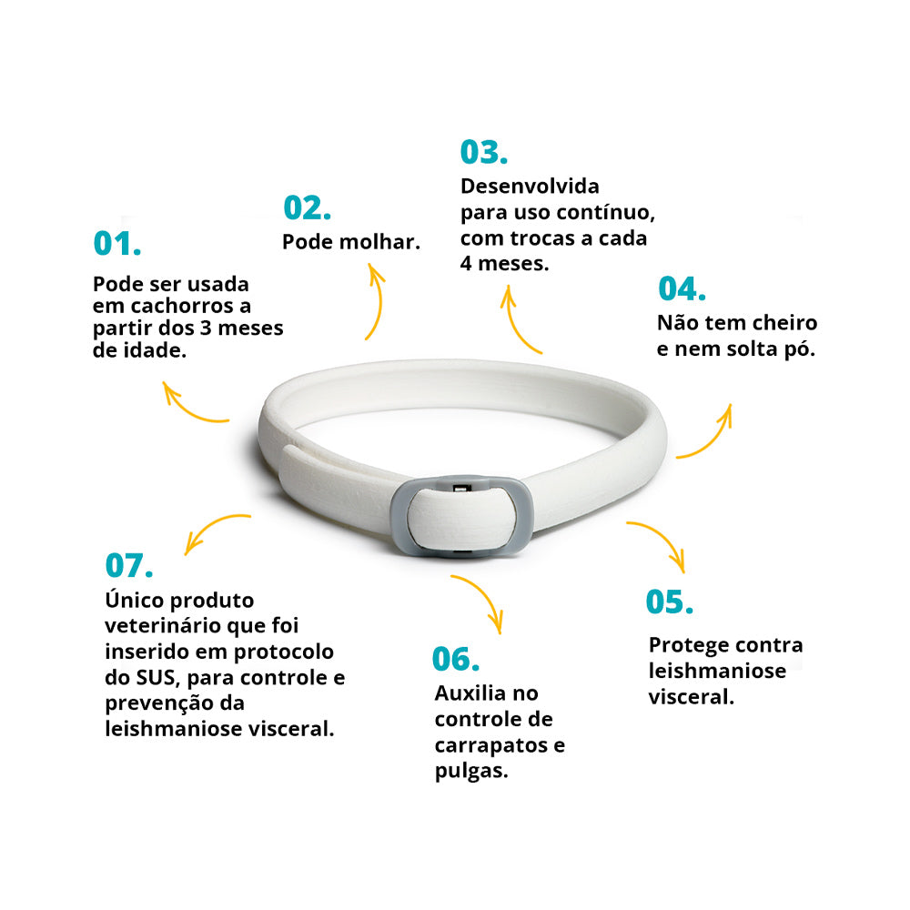 - Para mosquitos e moscas o controle é garantido por até 4 meses, efetuando a troca da coleira respeitando esses períodos;