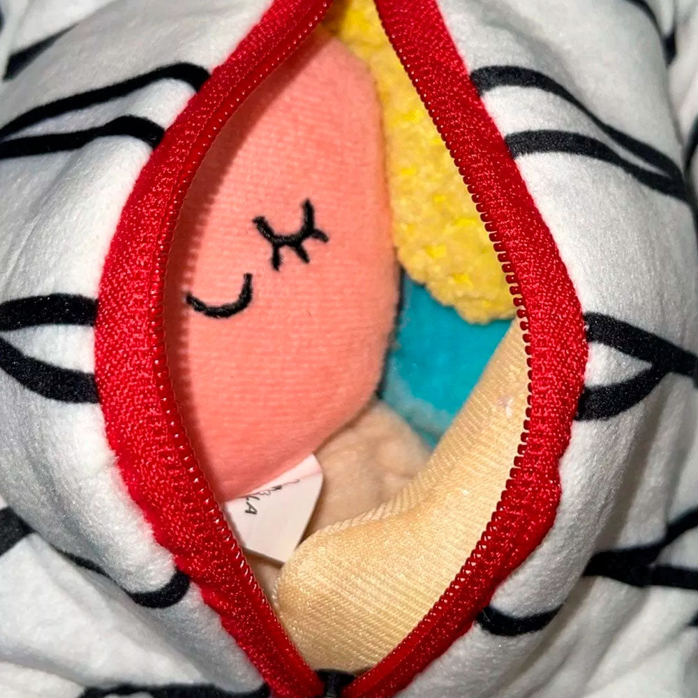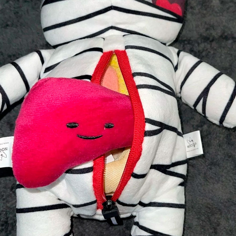 A múmia contém 8 mini pelúcias temáticas, como coração, pulmões e estômago, todas com apitos integrados para tornar a brincadeira ainda mais divertida.