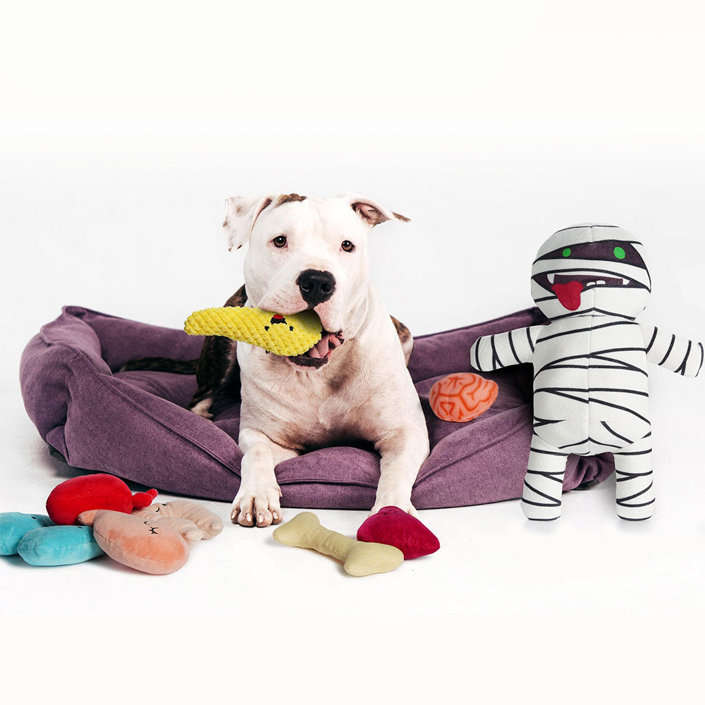 O corpo da múmia contém 8 mini pelúcias temáticas que seu cão pode arrancar, depois bastas recolocar dentro do corpo da múmia com facilidade. Cada mini pelúcia é fofa, tem apito e são perfeitas para seu cão brincar e morder. Quando ele terminar, é só guardar tudo novamente e recomeçar a diversão! Se você quiser deixar a brincadeira ainda mais divertida e estimulante também pode esconder petiscos em meio as mini pelúcias para que seu cão fareje e encontre. Ou ainda, pode usar a múmia como um fantoche para interagir com seu cão.